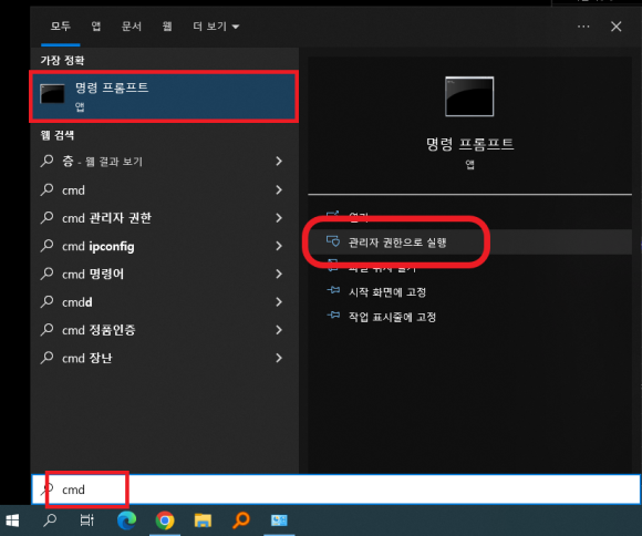 1. 시작 -> 검색버튼 -> "cmd"입력