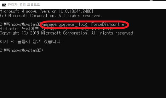 2. manage-bde.exe -lock -ForceDismount <해당드라이브 : >