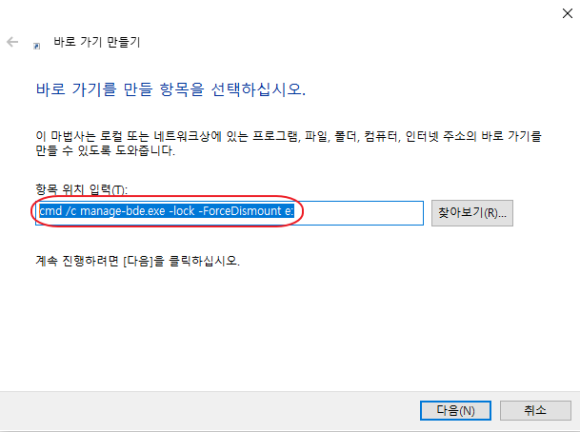 cmd /c manage-bde.exe -lock -ForceDismount <해당드라이브 : >